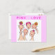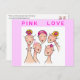 Ilustrador y caricaturista April McCallum, "Elevando cejas y haciendo impresiones" para la toma de conciencia sobre el cáncer de mama. Su ilustracion "Amor Rosa" de Cáncer de Mama en rosa suave y fresco y amarillo presenta a cinco mujeres con la cabeza calva con una gorra, flor, corazón o remolino. Texto: "AMOR ROSA".