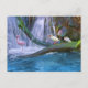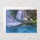Esta imagen de una cascada tropical contiene tres pájaros: flamingo rosa y dos ibises blancos. Es una bonita postal.