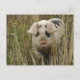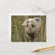 Esta bonita postal muestra una hermosa fotografía de un lindo cerdo moteado de rosa saliendo de una hierba alta.