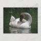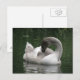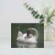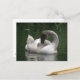 Esta postal muestra una fotografía de un hermoso cisne. El cisne es un ave juvenil, se nota por las plumas grises en la cabeza y la falta de un pico naranja. Parece que el cisne está durmiendo, pero en realidad está curando sus plumas.