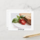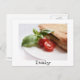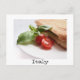 Postal con comida italiana sana consistente en un sándwich de panini y un tomate, hojas de albahaca verde y queso mozzarella sobre fondo blanco con el texto: "Italia".