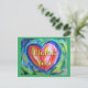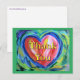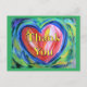El mensaje de la postal dice: "Gracias". La pintura presenta un corazón rojo colorido con destellos de acentos blancos y dorados. El corazón está delineado en azul y tiene un fondo verde suave. Esta pintura del corazón es un tributo a mantener la esperanza dentro de tu corazón cuando los tristes azules te rodean, pero seguir adelante hacia el verde renacimiento.