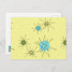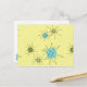 Este patrón de postales de estrenos atómicos icónicos amarillos presenta estallidos atómicos icónicos. ¡Así es! La vieja escuela, el fondo amarillo con especkles dorados es el escenario perfecto para el turquesa, el apetitoso apio y los círculos kitschy de color verde peral. Las manchas de color se colocan esporádicamente en varios tamaños, con líneas en forma de V negra superpuestas que forman las estallidas modas del sputnik. Diseñado siguiendo un patrón de platos de la década de 1950, este diseño de inspiración retro tiene todo lo necesario para ser realmente moderno a mediados de siglo.