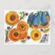 Acuarela, lápiz de color y dibujo de tinta de afiches morados en un estilo que recuerda a las impresiones botánicas. Estos dibujos son divertidos e imaginativos. Se reproducen maravillosamente en tarjetas y otros artículos impresos. Estos azulejos y Zinnias naranjas son dibujados con un espíritu animado, cálido y colorido