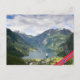 Foto postal que muestra el majestuoso paisaje del fiordo Geirangerfjord y la aldea de Geiranger entre las montañas de Noruega con bandera noruega.
