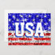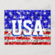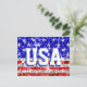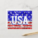 Postal con un diseño de estrellas y rayas con estrellas diseminadas sobre un estilizado fondo de patrón de "aspecto secuencial" y "USA" escrito en blanco y azul en el frente. Un diseño de personalizable rojo, blanco, gris plateado y azul para que puedas personalizar con tu propio texto, imágenes e ideas. Tenga en cuenta que esta es una imagen de arte digital impresa. Tenga en cuenta que se trata de una imagen de arte digital impresa, que no brilla ni contiene purpurinas o secuencias reales.