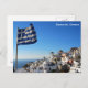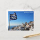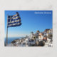 Postal de Grecia con paisaje de Santorini en el pueblo de Oia, con bandera griega.