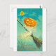 Una versión abreviada de All Hallow Eve o Evening, Halloween se ha transformado en una festividad que disfrutan adultos y niños por igual. Después de todo, ¡a quién no le encanta vestirse con un disfraz o truco o tratar dulces sabrosos y poco saludables! ... Este diseño de personalizable presenta una hermosa postal de color de época del siglo que muestra a una bruja con un vestido blanco que corre sentado delicadamente en su escoba voladora mientras vuela por el cielo azul nocturno iluminado con estrellas brillantes y una luna sonriente. ¡Tal vez ni te des cuenta de que tiene un naranja apropiado de Halloween calabaza jack-o-lantern para la cabeza! Debajo de ella están escritas las palabras "Halloween feliz" en una letra de oro.