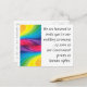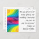 Un punto de inflexión en la historia crea una oportunidad perfecta para convertirse en un activista audaz. ¿Quiere animar a sus amigos y familiares que lo apoyan a abogar por la igualdad en el matrimonio? En el frente, esta tarjeta postal está diseñada para expresar la frustración de las parejas del mismo sexo que quieren casarse legalmente en los Estados Unidos, pero no por culpa de nuestro gobierno. En la parte de atrás hay información sobre cómo contactar a los funcionarios del Gobierno Federal para exigir igualdad de derechos humanos para todos los ciudadanos estadounidenses.