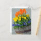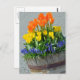 Naranja y tulipanes de primavera amarilla en la postal del plantador de barril