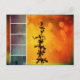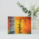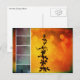 Tarjeta postal de una flor Pervoskia (Sabio Ruso) contra un fondo caliente amarillo y naranja con fotos de Collage en Aqua y rosa rosa con una pintura en metalizado aspecto texturizado.