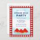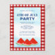 Invite a su familia y amigos a su celebración con esta tarjeta postal de invitación a la fiesta del 4 de julio. Está decorada con sandías acuáticas y un cielo azul sobre un fondo rojo y blanco de búfalo. Personalizable fácil. Esta invitación festiva es perfecta para cualquier tema de celebración del 4 de julio. Utilice la Herramienta de diseño para cambiar el tamaño, estilo o color del texto. Porque creamos nuestra obra de arte no encontrarás esta imagen exacta de otros diseñadores. Acuarela original © Michele Davies.