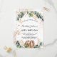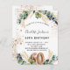 Para una fiesta de cumpleaños número 60. Un fondo blanco decorado con vegetación eucaliptos y hojas doradas. Lugares purpurinas de imitación dorada. Personalice y agregue sus nombres y detalles del boda. Letras de color negro y dorado. El número 60 se escribe con el tipo de letra de estilo globo. Parte posterior: fondo blanco y puntos purpurinas falsos dorados, diseño de postales. Sugerencia: Si no desea que se vea como una postal, haga clic en personalizar, vaya a la parte posterior y quite el separador y el sello postal.