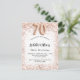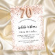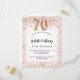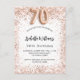 Por un elegante cumpleaños 70. Un fondo blanco. Decorada con oro rosa, purpurina falso rosa y chispas. Personalice y agregue un nombre y detalles del fiesta. El nombre está escrito con un guión de estilo con letras a mano, número 70 con fuentes de estilo globo.