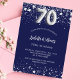 Una invitación moderna, elegante y glamurosa para una fiesta de cumpleaños número 70. Un fondo azul marino, decorado con estrellas de imitación plateadas. Personalice y agregue su nombre y detalles del fiesta. El número 70 se escribe con un tipo de letra de estilo globo.