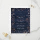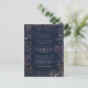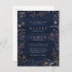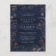 Invitación a una boda floral de moda con flores de oro rosa falsas y vegetación contra un fondo acuático azul marino con una tipografía moderna y elegante.