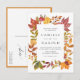 Esta postal de invitación a la boda presenta un marco de color agua suave en cálidos tonos otoñales como óxido, ámbar y verde oliva. Diseñado como una postal, ofrece una forma sencilla y elegante de invitar a sus huéspedes sin necesidad de sobres. Puede personalizar la parte delantera con sus nombres, fecha de boda y detalles del evento, mientras que la parte posterior incluye espacio para la información de correo o un mensaje opcional. Esta invitación a la boda de otoño aporta un toque acogedor de inspiración natural, ideal para los bodas rústicos o de otoño. Es una opción elegante y conveniente que mantiene las cosas hermosas y fáciles.