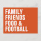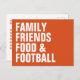 Esta es una audaz invitación de Acción de Gracias. El gran blanco en la parte delantera dice "comida y fútbol de amigos familiares" en un contexto festivo naranja - ambos son personalizable. La parte posterior incluye espacio para todos los detalles de su fiesta en el texto naranja en negrita. Esta moderna invitación con tarjeta postal de Acción de Gracias es una excelente manera de invitar a amigos y familiares a su divertida cena de Acción de Gracias. ¡También es perfecto como una invitación a cenar a los amigos!