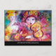Amor romántico entre Arlecchino y Colombina: Colorido y caprichoso violinista, una hermosa mujer rubia con trajes brillantes emplumados con florituras de color burdeos rojo en la parte posterior de la tarjeta. . Pintura en acuarela de Bulgan Lumini (c) en colores rosa brillante, fucsia, verde, rojo, azul, amarillo, con destellos de oro inspirados en la Comedia del Arte (Commedia dell'arte) y el Carnaval de Venecia.