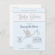 Elegante y lindo diseño de ducha de bebé. Con un guión de caligrafía Baby Shower en color plateado y una cigüeña en color plateado con un bebé con puntos de polka blanco y un suave fondo azul. Personalice cambiando el texto con sus propios detalles o haga clic en personalizar para añadir su propio toque.