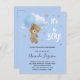 Para una ducha de bebé celebrando a un niño. Un fondo azul con estrellas. Un oso de peluche sostiene un globo azul claro. Personalice y agregue el nombre de la futura madre y los detalles del fiesta. El nombre y el texto: ¡Es un niño! están escritos con una escritura de estilo con letras a mano. Fondo azul, diseño postal. Sugerencia: Si no desea que se vea como una postal, haga clic en personalizar, vaya a la parte posterior y quite el separador y el sello postal.