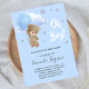 Para una ducha de bebé celebrando a un niño. Un fondo azul con estrellas. Un oso de peluche sostiene un globo azul claro. Personalice y agregue el nombre de la futura madre y los detalles del fiesta. El nombre y el texto: Oh Boy! están escritos con una escritura a mano con letras. Fondo azul, diseño postal. Sugerencia: Si no desea que se vea como una postal, haga clic en personalizar, vaya a la parte posterior y quite el separador y el sello postal.