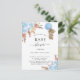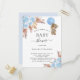 Para una moderna ducha tipo boho. Fondo blanco. Decorada con flores azules claras, rosas, pampas y un niño de oso de peluche sosteniendo un globo azul. Personalice y agregue un nombre y detalles del fiesta. Sugerencia: Si no desea que se vea como una postal, haga clic en personalizar, vaya a la parte posterior y quite el separador y el sello postal.