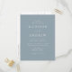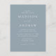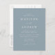 Postal minimalista y moderna de invitación a la boda con los detalles de su boda en letras blancas con acentos caligráficos. El fondo azul polvoriento puede cambiarse a un color de su elección. Personalice la parte posterior de la tarjeta postal de invitación a la boda de la moda con su dirección de retorno, la fecha de respuesta deseada, el sitio web del boda y las instrucciones para los invitados que utilicen las plantillas de texto proporcionadas. Diseñado para coordinar con nuestra colección de bodas Modern Elegance.