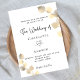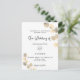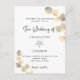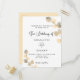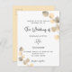 Un fondo blanco decorado con brotes de eucaliptos dorados. Personaliza y tu nombre y detalles de la ceremonia. Letras de color negro. Atrás: fondo dorado