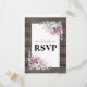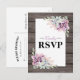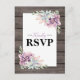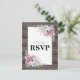 Tarjetas de respuesta de boda con estilo campestre que presentan un fondo de granero de madera rústica, una exhibición de esquina de suculentas y una plantilla de texto de rsvp rústica que es fácil de personalizar.