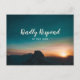 Tarjeta postal de respuesta de boda elegante y moderna. El fondo es una hermosa fotografía de un cielo nocturno azul turquesa oscuro con una galaxia de estrellas arriba y un amanecer sobre montañas abajo. El texto es totalmente personalizable y aparece en una combinación elegante de letra manuscrita y fuentes sans serif.