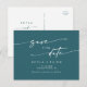 Esta boda azul verde azulada de moda boho salva la postal de la invitación a la fecha es perfecta para un boda minimalista. El audaz tono de joyería turquesa oscuro presenta un diseño bohemio moderno con una caligrafía rústica sencilla con un estilo único y clásico. Personalice su tarjeta postal de fecha con sus nombres, fecha de boda, ubicación y dirección del sitio web del boda.