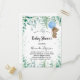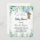 Para una ducha de bebé, celebrando a un bebé. Un fondo blanco. un lindo oso de peluche sosteniendo un globo azul, vegetación eucalipto, helechos de bosque y chispas verdes. Personalice y agregue el nombre del nombre de la futura madre y los detalles del fiesta. El nombre y el texto: Baby Shower se escriben con un guión de estilo con letras a mano