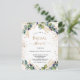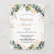 Un fondo blanco decorado con vegetación eucalipto, hojas doradas y polvo falso purpurina dorado. Personaliza y la novia para ser el nombre y los detalles del fiesta. Letras de color negro y dorado. Atrás: diseño postal. Sugerencia: Si no desea que se vea como una postal, haga clic en personalizar, vaya a la parte posterior y quite el separador y el sello postal.