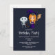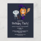 Cartel de invitación a la fiesta de cumpleaños de Halloween con una bruja linda usando un gran gorra de brujas moradas. Su gato negro descansando sobre su cabeza. Ella tiene el pelo largo naranja y lleva una escoba. A su lado hay un esqueleto blanco y amistoso. El ilustracion personalizado es perfecto para halloween.