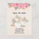 Tarjeta postal de guardar la fecha con calabazas blancas de acuarela elegante con acentos de brillo dorado falso. Rodeadas de hojas verdes y flores silvestres rosadas.