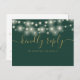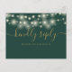 Una elegante tarjeta RSVP con guion de firma con luces de cuerda de bonito y tipografía moderna de oro en un fondo verde esmeralda. El reverso cuenta con tus detalles y una divertida petición de canciones de invitados. Diseñado por Thisisnotme©