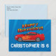 A los niños pequeños les encantan los autos de carreras de juguetes que aceleran la pista. Este auto deportivo rojo y anárquico es un verdadero ganador. Fondo azul brillante con llamas naranja y amarillas y texto y colores vivos y brillantes para el hombre de 6 años o cualquier edad! Copyright del diseño © CustomInvitesOnline.com