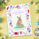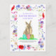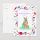 Organice una dulce y elegante celebración de primavera con esta adorable tarjeta postal de invitación para una búsqueda de huevos de Pascua y un brunch con conejito de acuarela, perfecta para niños, familias y fiestas en el jardín. Este encantador diseño de tarjeta postal económico presenta un lindo conejo rosa que sostiene tres huevos de Pascua coloridos, hermosamente enmarcado por un borde boho de flores silvestres de acianos, amapolas, margaritas y flores de prado para un aspecto fresco y moderno de primavera.