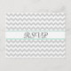 Elegante tarjeta de posteo de respuesta RSVP de boda hecha en un patrón de zigzag chevron gris claro y blanco, en la parte delantera, con una banda verde y blanca de menta, a través de la lectura de texto medio y negro RSVP. La parte posterior se realiza en un gris pálido, con una fina línea verde menta que separa la parte de la tarjeta de respuesta de la parte de la dirección de retorno de la tarjeta postal. Personalice el texto para adaptarlo a sus necesidades bodas. Productos bodas a juego disponibles.