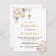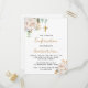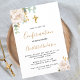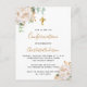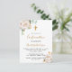 Un fondo blanco decorado con vegetación eucaliptos, peonía blanca y hojas doradas. Personalización y nombre y detalles de la ceremonia. Letras de color negro y dorado.