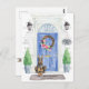 Anuncie su nueva dirección con nuestra elegante invitación con Doberman, puerta delantera azul, alfombra de bienvenida, topiarios y una corona floral sobre un fondo de ladrillo gris.