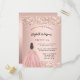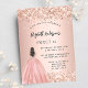 Una invitación moderna, elegante y glamurosa para una fiesta de 16 y 16 años. Un fondo dorado rosa con polvo falso purpurina de oro, un chica con un vestido de bola. El nombre está escrito con una escritura de estilo con letras a mano moderna. Personalice y agregue los detalles de su fiesta.