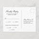 Postal tradicional RSVP de boda en blanco y negro clásico con un diseño sencillo con "Kindly Reply" en una elegante caligrafía dentro de un delgado borde. El reverso tiene una plantilla para la respuesta, la elección de la comida y su dirección de retorno para un envío fácil. Este elegante diseño es perfecto para un boda formal.