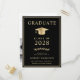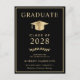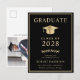 Elegante invitación de graduación de la universidad negra y postal de invitación de fiesta con un gorro de graduación de oro y una simple tipografía moderna de oro ligero para el nombre del graduado, año de clase, universidad o universidad, grado y especialidad o honores. En la parte posterior, añada una foto y los detalles del fiesta de grado.