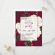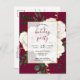 Este bonito diseño de cristal presenta un ramo de rosas blancas vintage en la parte delantera sobre un fondo rojo burdeos, profundo y rico, delineado y salpicado con purpurina dorado para chispa extra. El ramo también incluía eucaliptos y otros elementos verdes, además de una cinta dorada festiva. Los detalles del fiesta aparecen en un sobre blanco de borde dorado semitransparente que deja pasar las flores. Las palabras, "fiesta de fiesta" aparecen en rojo burdeos marrón en una elegante tipografía de escritura a la moda con un aspecto con letras a mano. Los detalles del fiesta de personalizable aparecen en negro en un texto mínimo, fácilmente legible, con una dirección de retorno de personalizable y un mensaje en la parte posterior. Puede personalizar este elemento cambiando el texto de la plantilla de producto.