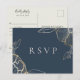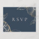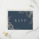 Hermosa tarjeta de respuesta de boda con arte de línea dorada elegante, flores y follaje con solicitud de canción. El color de fondo que se muestra en azul marino de moda se puede personalizar.