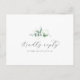 Esta elegante tarjeta postal de RSVP, que se canta por la vegetación, es perfecta para un boda sencillo. El moderno y elegante diseño presenta un diseño botánico natural de eucaliptos, hojas y plantas con un sutil acento acuático verde de menta. ¡Elabore su lista de invitados bodas y su lista de canciones de la pista de baile al mismo tiempo! Esta postal de respuesta boda le pregunta convenientemente a los invitados si podrán asistir a su boda, y también qué canción les hará bailar.