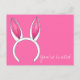 ¡Personaliza con los datos de tu evento! Diseño de invitación estilo postal que incluye una ilustración original a mano de un par de orejas de conejo rosadas y blancas. Ideal para una fiesta de bebé o celebración de Pascua.
