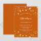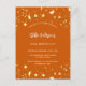 Un fondo naranja quemado decorado con estrellas doradas. Personalice y agregue un nombre y detalles del fiesta. El nombre está escrito con un guión de estilo con letras a mano, letras de color blanco.
